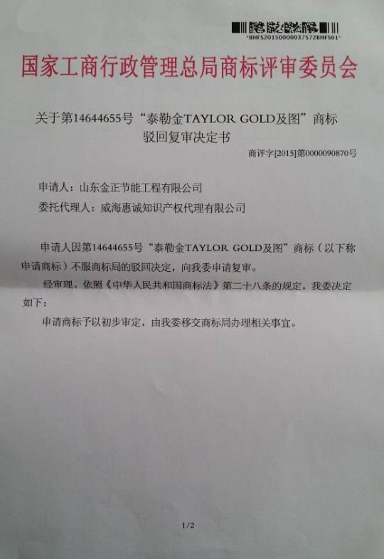 我所為山東金正節(jié)能工程技術(shù)有限公司商標(biāo)駁回復(fù)審成功
