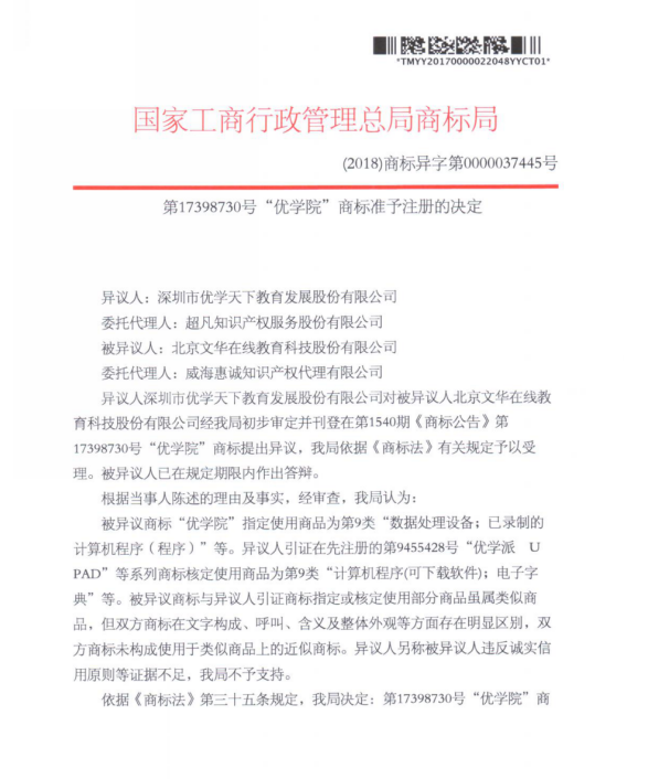 我所代理的優(yōu)學(xué)院商標(biāo)異議答辯成功